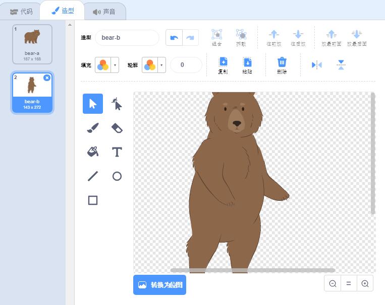 首先我們隨意添加一個角色,比如熊。在角色設置區選中這個角色(如果只有一個角色,默認是選中狀態),之后我們點擊左側上部的【造型】按鈕切換到造型頁面。在造型編輯頁面最左邊顯示此角色的造型個數,通常Scratch內置角色都有不少于2個造型,以供編程時選擇或者動態場景使用