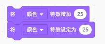 我們以上圖指令為例來講解。在選擇下拉菜單中,有顏色、魚眼、旋渦、像素畫、馬賽克、亮度、虛像(透明度)等特效,每次運行增加一定數值??梢岳斫鉃閷⒋朔N特效,運行一次,增加一定程度,這個程度就是用后面的數字來量化表示。每種特效我們建議大家都親自試用一下。顯示隱藏