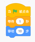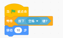 以上案例表示點擊程序運行按鈕后,程序并不立即執(zhí)行,而是處于等待狀態(tài)。等待用戶按下空格鍵之后才執(zhí)行之后的指令。當(dāng)用戶摁下鍵盤上空格鍵后,角色才會移動10步