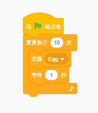 程序開始執(zhí)行,我們每隔一秒鐘克隆一次雞蛋。在雞蛋角色上的代碼如下: