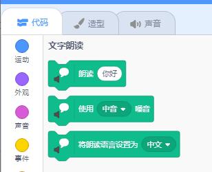 首先在擴(kuò)展功能中添加文字朗讀,文字朗讀代碼指令分組一共有三個(gè)指令,如下:
