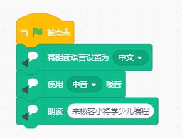 首先在擴(kuò)展功能中添加文字朗讀,文字朗讀代碼指令分組一共有三個(gè)指令,如下:例如我們朗讀 來極客小將學(xué)少兒編程 這段文字,我們添加如下代碼:我們建議在朗讀之前,先設(shè)置朗讀語言,因?yàn)槿绻首x文字語種和設(shè)置的語種不一致,是無法朗讀的。當(dāng)然在朗讀時(shí)候我們可以通過設(shè)置嗓