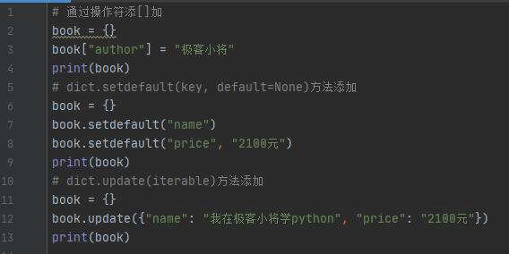字典的添加操作,主要有三種方式。通過操作符:[]添加, dict.setdefault(key, default=None)方法添加,以及dict.update(iterable)方法添加。以下以示例講解: