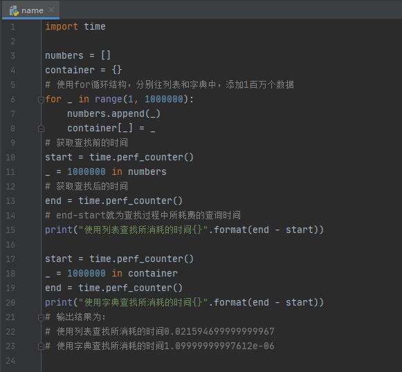 哈希表中的編號即為鍵名的哈希值,數據表中存儲了哈希值,以及鍵名,鍵值。Python字典的底層實現中,并非直接存儲鍵名,鍵值,存儲的是它們的引用。哈希(hash)函數又稱為散列函數,計算鍵名的哈希值,就是將字典中的鍵名轉換為對應的數字編號。現在來寫個簡單的代碼,來比較列表和字典的查找性能。