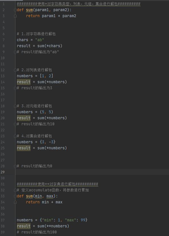 使用*對可迭代對象進行解包:迄今為止學(xué)過的可迭代對象有:字符串類型,列表,元組,字典,集合。在對字典,集合等類型進行解包時,解包出的元素為對應(yīng)的鍵名。在實際開發(fā)中,通常使用**操作符對字典進行解包。