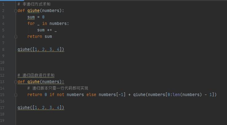 遞歸函數較非遞歸函數,會更難理解,在熟練掌握了遞歸函數的用法以后,可以寫出更加簡潔的代碼。比如計算幾個數字的和: