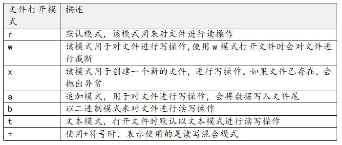 file 對應(yīng)的是文件的路徑名,mode 對應(yīng)的是文件的打開模式,buffering對應(yīng)的是文件緩沖,encoding對應(yīng)的是文件數(shù)據(jù)流的編碼, errors表示的是對文件的讀寫過程中出現(xiàn)了編碼問題時,該以什么樣的方式進行處理。在通過open函數(shù)對文件進行讀寫操作前,我們需要先掌握文件的打開模式。
