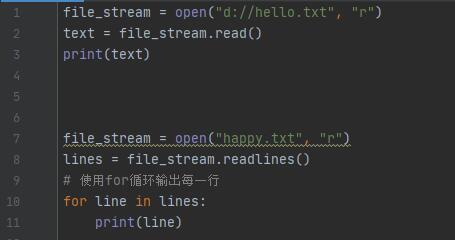 在執(zhí)行open方法獲取文件流對象以后,可以直接使用for循環(huán)來對文件流對象進行逐行讀取。