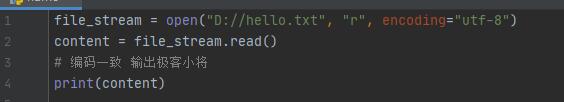 在執(zhí)行open函數(shù)獲取文件流對(duì)象時(shí),可以通過encoding參數(shù)來指定文件讀寫時(shí)的編碼。只有當(dāng)文件自身編碼和代碼書寫編碼保持一致時(shí),才能正確的讀取文件內(nèi)容,否則將拋出異常。例如我們用編輯器打開hello.txt輸入極客小將四個(gè)字,之后保存為uft-8編碼格式。