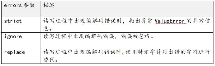 對(duì)文件讀寫進(jìn)行錯(cuò)誤處理:open方法中的errors參數(shù),用來控制出現(xiàn)編碼和解碼的錯(cuò)誤時(shí)該如何處理。errors參數(shù)只能用于文本模式。