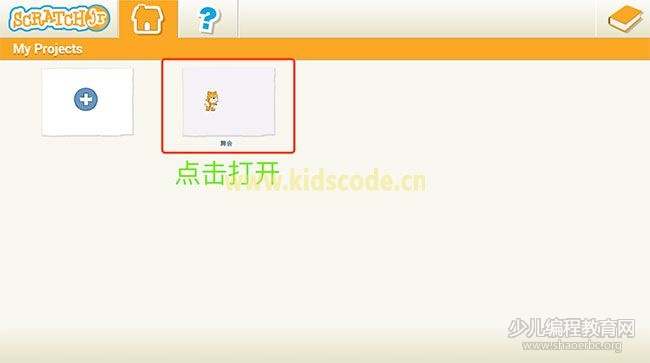 主屏幕顯示您所有的保存scratchjr項目。如果這是您的第一個項目,您將只看到加號,如下圖所示,點擊加號創建一個新項目。