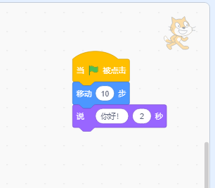 我們將左側(cè)運(yùn)動分組【移動10步】指令拖動到中間腳本區(qū)域,然后將外觀分組【說你好2秒】指令拖動到【移動10步】指令下方。兩個指令會像積木一樣疊加在一起,因此Scratch編程也叫做積木式編程。最后我們將事件分組中【當(dāng)綠旗被點(diǎn)擊】拖動到之前兩個積木的上方。如下圖: