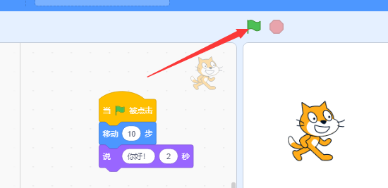 這樣一個簡單的Scratch程序就編寫完成了。我們點(diǎn)擊Scratch頂部中間偏右測的綠旗標(biāo)志來運(yùn)行程序。