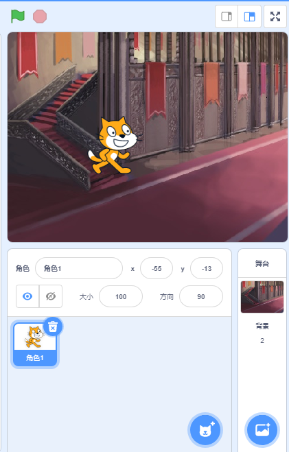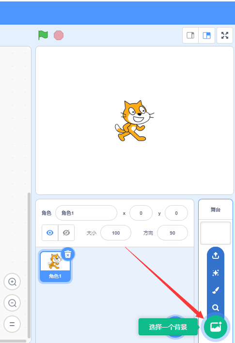 添加背景和添加角色類似,添加背景按鈕在Scratch面板的最右側。