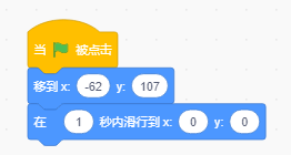 此指令表示,在一秒時間內勻速的移動到指定坐標位置(x:-50,y:100),然后在下一秒內勻速的移動到幕布背景原點,點擊綠旗運行按鈕可以查看效果。