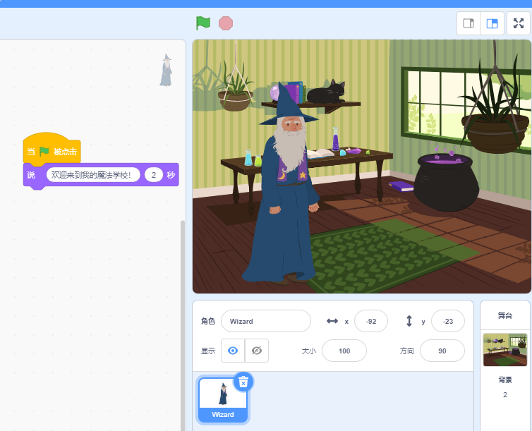 這里我們添加了一個白胡子男巫,然后我們添加一個小精靈學生角色,并且將這個角色的造型進行翻轉操作