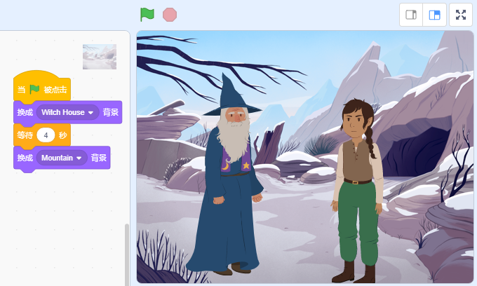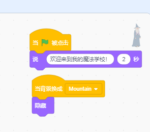 這時候我們看到白胡子男巫也被帶進新背景下了,這顯然是不符合交談情景的。因此我們需要在切換新背景的時候,將白胡子男巫這個角色隱藏掉。代碼如下: