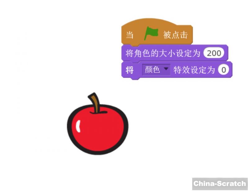 打開(kāi)Scratch工具從角色庫(kù)當(dāng)中選擇蘋果角色,選中當(dāng)前角色對(duì)其進(jìn)行積木程序編寫。如圖右上角程序,此時(shí)使用顏色特效設(shè)定積木塊設(shè)定數(shù)值為0,發(fā)現(xiàn)蘋果角色顏色沒(méi)有發(fā)生明顯改變!當(dāng)將顏色特效設(shè)定70時(shí),蘋果角色顏色變成了綠色。當(dāng)將顏色特效設(shè)定130時(shí),蘋果角色顏色變成了藍(lán)色