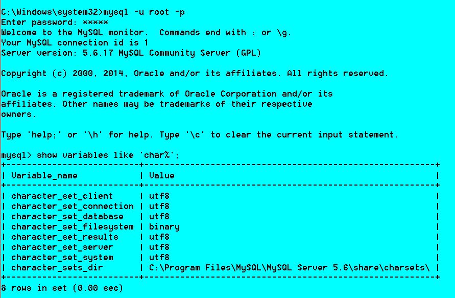 1)輸入 mysql -u root -p 進(jìn)入mysql數(shù)據(jù)庫(kù) 2)鍵入密碼:*****(自己的密碼,沒有的話直接回車鍵,嗯其他情況如忘了root密碼百度去orz。。) 3)show variables like 'char%'; 顯示編碼格式下圖一為未修改my.ini配置文件的編碼文件latin1(即ISO-8859-1),圖二為已經(jīng)修改過的。ouv少兒編程網(wǎng)-Scratch_Python_教程_免費(fèi)兒童編程學(xué)習(xí)平臺(tái)