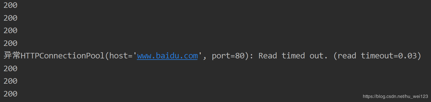 import requests url = 'http://www.baidu.com' # 循環發送請求50次 for a in range(0, 50): try: # timeout數值可根據用戶當前網速,自行設置 response = requests.get(url, timeout=0.03) # 設置超時為0.03 print(response.status_code) except Exception as e: print('異常'+str(e)) # 打印異常信息部分輸出結果如下:qOD少兒編程網-Scratch_Python_教程_免費兒童編程學習平臺