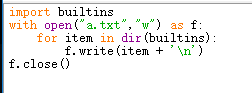 with open("a.txt","w") as f: for item in dir(builtins): f.write(item + ' ') f.close()