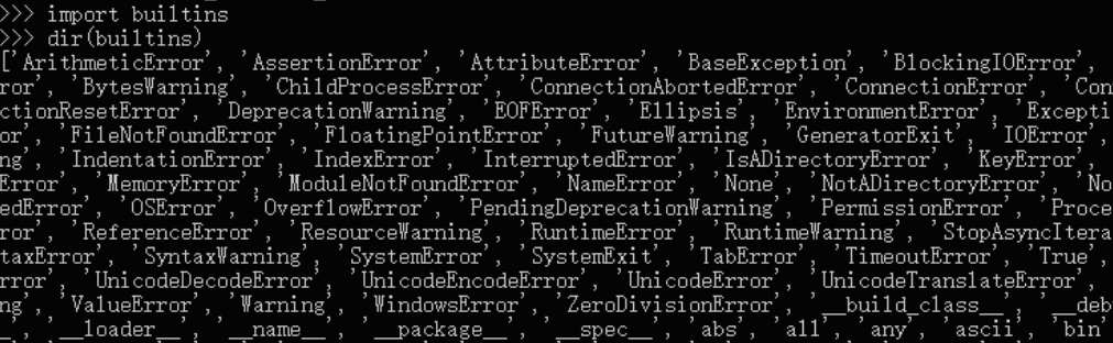 2、導入builtins模塊,輸入dir(builtins)回車輸出所有內置函數FQL少兒編程網-Scratch_Python_教程_免費兒童編程學習平臺