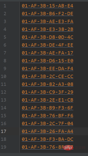 import random import string def create_mac(): MAC='01-AF-3B' hex_num =string.hexdigits #0123456789abcdefABCDEF for i in range(3): n = random.sample(hex_num,2) sn = '-' + ''.join(n).upper() MAC += sn return MAC def main(): with open('mac.txt','w') as f: for i in range(100): mac = create_mac() print(mac) f.write(mac+' ') main()復(fù)制代碼