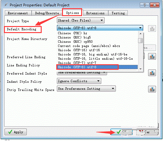 2、依次進(jìn)入options-default encoding,然后選擇編碼為Unicode(utf-8),點(diǎn)擊確定即可。gcM少兒編程網(wǎng)-Scratch_Python_教程_免費(fèi)兒童編程學(xué)習(xí)平臺(tái)