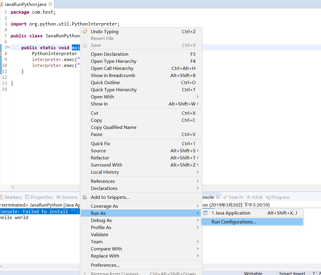 package com.test; import org.python.util.PythonInterpreter; public class JavaRunPython { public static void main(String[] args) { PythonInterpreter interpreter = new PythonInterpreter(); interpreter.exec("a='hello world'; "); interpreter.exec("print a;"); } }輸出結果如下:r35少兒編程網-Scratch_Python_教程_免費兒童編程學習平臺