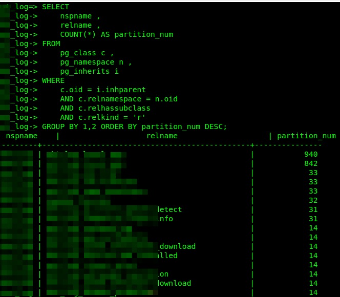 備注:如果表是分區(qū)表,那么相應(yīng)的 pg_class.relhassubclass 字段為 ‘t’,否則為 ‘f’,下面是我在生產(chǎn)庫(kù)查詢的例子。uH7少兒編程網(wǎng)-Scratch_Python_教程_免費(fèi)兒童編程學(xué)習(xí)平臺(tái)