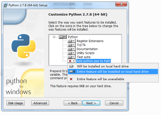 選擇 Add python.exe to Path>>Entire feature will be installed on local hard drive