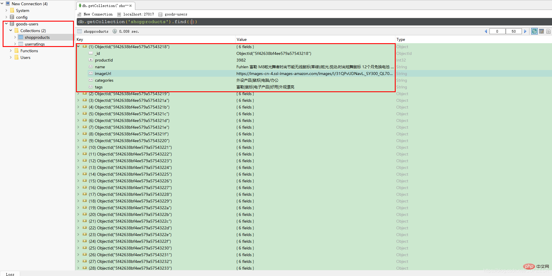 import pymongoclass Product: def __init__(self,productId:int ,name, imageUrl, categories, tags): self.productId = productId self.name = name self.imageUrl = imageUrl self.categories = categories self.tags = tags def __str__(self) -> str: return self.productId +'^' + self.name +'^' + self.imageUrl +'^' + self.categories +'^' + self.tagsclass Rating: def __init__(self, userId:int, productId:int, score:float, timestamp:int): self.userId = userId self.productId = productId self.score = score self.timestamp = timestamp def __str__(self) -> str: return self.userId +'^' + self.productId +'^' + self.score +'^' + self.timestampif __name__ == '__main__': myclient = pymongo.MongoClient("mongodb://127.0.0.1:27017/") mydb = myclient["goods-users"] # val attr = item.split("\^") # // 轉(zhuǎn)換成Product # Product(attr(0).toInt, attr(1).trim, attr(4).trim, attr(5).trim, attr(6).trim) shopproducts = mydb['shopproducts'] with open('shopproducts.csv', 'r',encoding='UTF-8') as f: item = f.readline() while item: attr = item.split('^') product = Product(int(attr[0]), attr[1].strip(), attr[4].strip(), attr[5].strip(), attr[6].strip()) shopproducts.insert_one(product.__dict__) # print(product) # print(json.dumps(obj=product.__dict__,ensure_ascii=False)) item = f.readline() # val attr = item.split(",") # Rating(attr(0).toInt, attr(1).toInt, attr(2).toDouble, attr(3).toInt) userratings = mydb['userratings'] with open('userratings.csv', 'r',encoding='UTF-8') as f: item = f.readline() while item: attr = item.split(',') rating = Rating(int(attr[0]), int(attr[1].strip()), float(attr[2].strip()), int(attr[3].strip())) userratings.insert_one(rating.__dict__) # print(rating) item = f.readline()在啟動(dòng)MongoDB服務(wù)后,運(yùn)行Python代碼,運(yùn)行完成后,再通過(guò)Robo 3T查看數(shù)據(jù)庫(kù)如下: