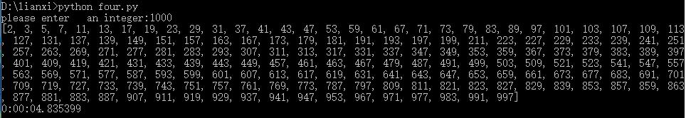 import time import math start=time.process_time() m=input('please enter an integer:') i = int(m) #創(chuàng)建一個空list0 r=list() #添加元素2 r.append(2) #從3開始挨個篩選 for a in range(3,i): b=False #用a除以小于a的質數(shù)b for b in r: if a%b==0: b=False break else: b=True if b==True: r.append(a) print(r) t=(time.process_time()-start) print(t)運行結果展示: