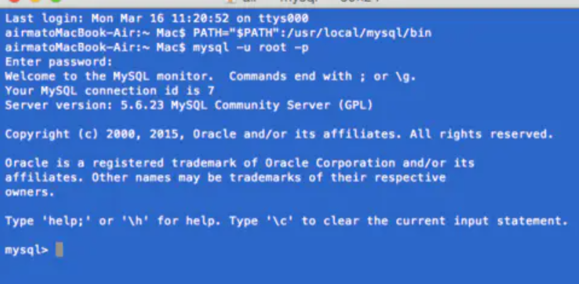 3、在終端登錄到MySQL的命令如下: mysql -u root -pl3B少兒編程網-Scratch_Python_教程_免費兒童編程學習平臺
