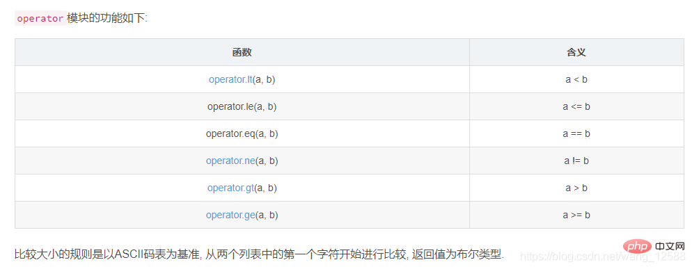 list.count(x)a = ['p','y','t','h','o','n','y'] print(a.count('y')) # 運行結果 》》》2 # 查找有幾個這種元素list.copy(x)a = ['p','y','t','h','o','n'] print(a.copy()) # 運行結果 》》》['p', 'y', 't', 'h', 'o', 'n']cmp(list1, list2),這里用operator模塊# cmp是python2中的函數,python3中以無法使用,可以用operator代替,效果一樣的 a = ['11','22','33'] b = ['22','33','44'] import operator print(operator.eq(a,b)) # 運行結果 》》》False這里有一種關于operator模塊的使用,感興趣的朋友可以了解一下