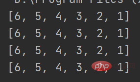 # 第一種方法,使用append a = [1,2,3,4,5,6] b = [] for i in a: b.append(a[6-i]) print(b) # 第二種方法,切片的運用 a = [1,2,3,4,5,6] print(a[::-1]) # 第三種方法,反轉列表 a = [1,2,3,4,5,6] a.reverse() print(a) # 第四種方法,排序 a = [1,2,3,4,5,6] a.sort(reverse=True) print(a)運行結果如下: