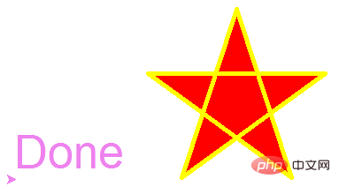 # coding=utf-8 import turtle import time turtle.pensize(5) turtle.pencolor("yellow") turtle.fillcolor("red") turtle.begin_fill() for _ in range(5): turtle.forward(200) turtle.right(144) turtle.end_fill() time.sleep(2) turtle.penup() turtle.goto(-150,-120) turtle.color("violet") turtle.write("Done", font=('Arial', 40, 'normal')) turtle.mainloop()