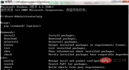 **后,再次進入cmd,輸入pip,顯示為如圖,配置pip成功。ZTc少兒編程網-Scratch_Python_教程_免費兒童編程學習平臺