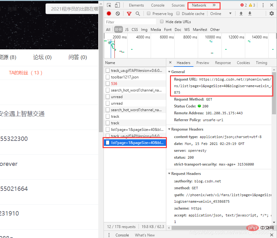 url = 'https://blog.csdn.net//phoenix/web/v1/fans/list?page=1&pageSize=40&blogUsername=weixin_45386875' #關(guān)注我的部分請求地址#url = 'https://blog.csdn.net//phoenix/web/v1/follow/list?page=1&pageSize=40&blogUsername=weixin_45386875' #我關(guān)注的部分請求地址請求地址獲取方法: