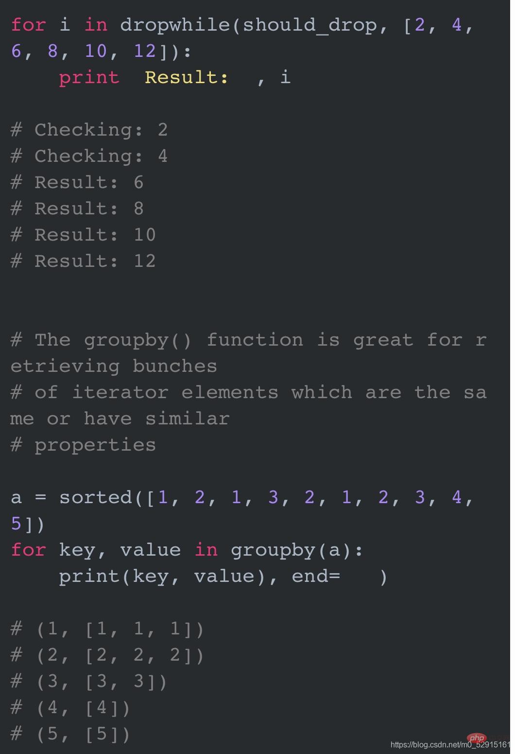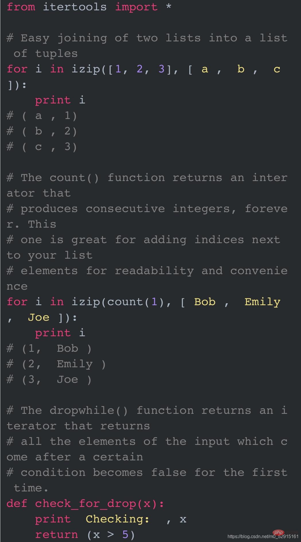 使用 Itertools 模塊中的函數(shù)讓你可以執(zhí)行很多迭代器操作,這些操作通常需要多行函數(shù)和復(fù)雜的列表理解。關(guān)于 Itertools 的神奇之處,請看以下示例:
