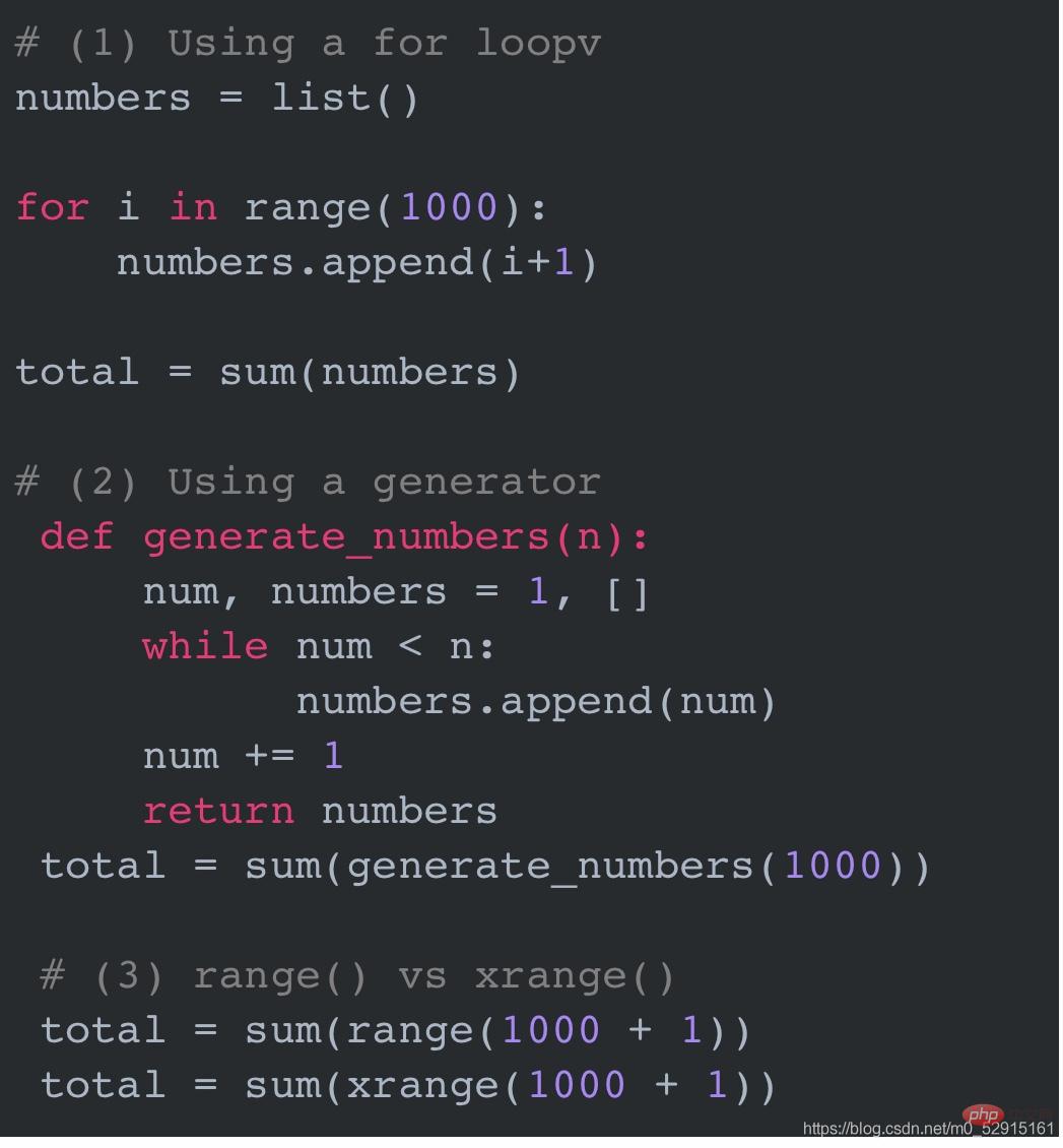 代碼中第二部分展示了使用 Python generator 函數(shù)對數(shù)字列表求和。generator 函數(shù)創(chuàng)建元素,并只在必要時將其存儲在內(nèi)存中,即一次一個。這意味著,如果你要創(chuàng)建十億浮點數(shù),你只能一次一個地把它們存儲在內(nèi)存中!Python 2.x 中的 xrange() 函數(shù)就是使用 generator 來構(gòu)建列表。p63少兒編程網(wǎng)-Scratch_Python_教程_免費兒童編程學(xué)習(xí)平臺
