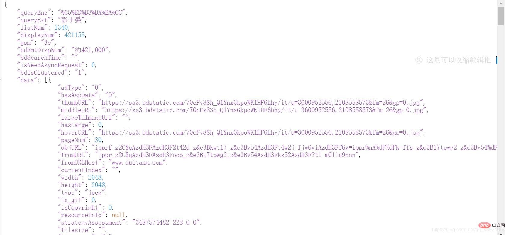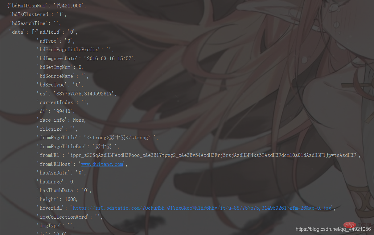url = 'https://image.baidu.com/search/acjson?' param = { 'tn': 'resultjson_com', 'logid': ' 7517080705015306512', 'ipn': 'rj', 'ct': '201326592', 'is': '', 'fp': 'result', 'queryWord': '彭于晏', 'cl': '2', 'lm': '-1', 'ie': 'utf-8', 'oe': 'utf-8', 'adpicid': '', 'st': '', 'z': '', 'ic': '', 'hd': '', 'latest': '', 'copyright': '', 'word': '彭于晏', 's': '', 'se': '', 'tab': '', 'width': '', 'height': '', 'face': '', 'istype': '', 'qc': '', 'nc': '1', 'fr': '', 'expermode': '', 'force': '', 'cg': 'star', 'pn': '30', 'rn': '30', 'gsm': '1e', } # 將編碼形式轉換為utf-8 response = requests.get(url=url, headers=header, params=param) response.encoding = 'utf-8' response = response.text print(response)運行結果如下: