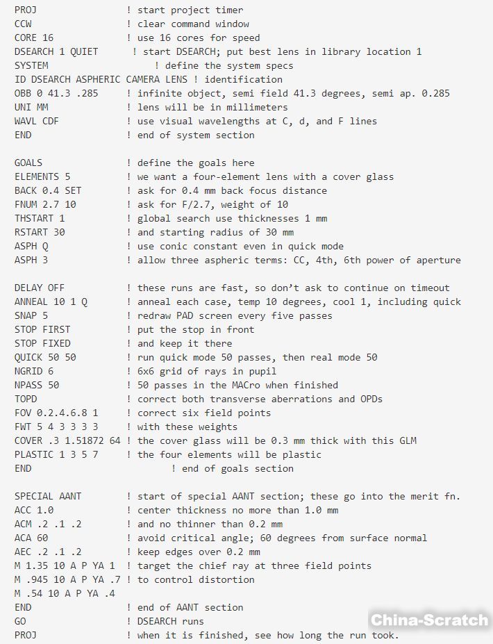 2.注意DSEARCH輸入文件中的FNUM請求指定權(quán)重為10; 這比表面看起來更重要。 如果我們不考慮權(quán)重因子,程序?qū)⑼ㄟ^近軸求解精確地控制F /number - 如果得到的半徑太大,則可能導(dǎo)致光線失效。 因此,對于像這樣的快速鏡頭,我們通常會增加一個權(quán)重。 然后程序向評價函數(shù)添加一個控制F /number的約束,半徑由RSTART值給出。 在第二個例子中,我們沒有以圖像高度為目標(biāo),如果我們分配了較低的權(quán)重,則F / number可能會比目標(biāo)值大。如果我們分配了更低的權(quán)重。這個程序?qū)鋈魏问虑閬頊p少評價函數(shù),并且放棄一點代價可能會顯著降低其他的像差,從而在更高的F/number下產(chǎn)生一個完美的圖像。所以我們指定了一個10的權(quán)重,這樣解看起來就不會那么吸引人了。