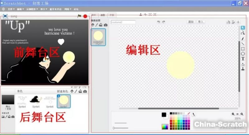 ? ? ? ?本節課,了解scratch編程軟件的功能區,共分三個功能區,分別為前舞臺區,后舞臺區,編輯區。 ? ? ? ?后舞臺區分為舞臺場景,角色。 ? ? ? ?后舞臺區的每個舞臺場景和每個角色都可以在前舞臺區顯示,也可以在編輯
