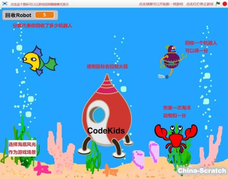 CodeKids老師今天要教大家做一個(gè)外星火箭來大海里回收從CodeKids星球逃跑的機(jī)器人的游戲。這個(gè)游戲的目標(biāo)是盡可能多的回收機(jī)器人,但要小心保護(hù)海里的小動(dòng)物們。 今天的游戲是用Scratch編程語言設(shè)計(jì)出來的。Scratch簡單易學(xué),小朋友們不需要用鍵盤敲出復(fù)