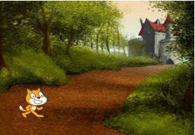 編程實(shí)現(xiàn): 小貓從坐標(biāo)點(diǎn)(-165,-93)出 發(fā)向城堡走去。隨著位置的移 動(dòng),角色大小逐漸變小,最后 在城堡前消失。