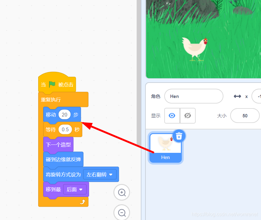按要求完成上面的例子,同學們可以擴展一下,讓公雞在草地上隨機的走動