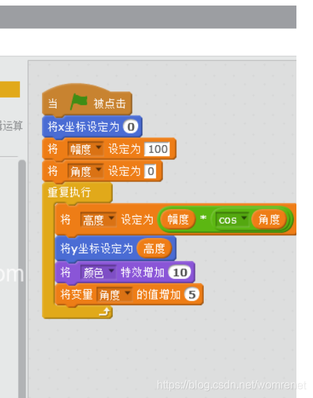 運動軌跡的過程就是0到1,1到0,0到-1,-1到0的過程,通過用循環命令讓小球在背景中做上下來回運動。我們需要建立三個變量:角度、幅度、高度。角度為三角函數里面的變量值,幅度為小球的最大擺動幅度,而幅度乘以cos(角度)就等于小球的高度。將小球的y坐標值設為高度值,通過不斷增加角度值,來實現小球的高度不斷變化。同時在這里加了一個顏色特效增加的命令,可以讓我們看到一個彩色的小球在做鐘擺運動。