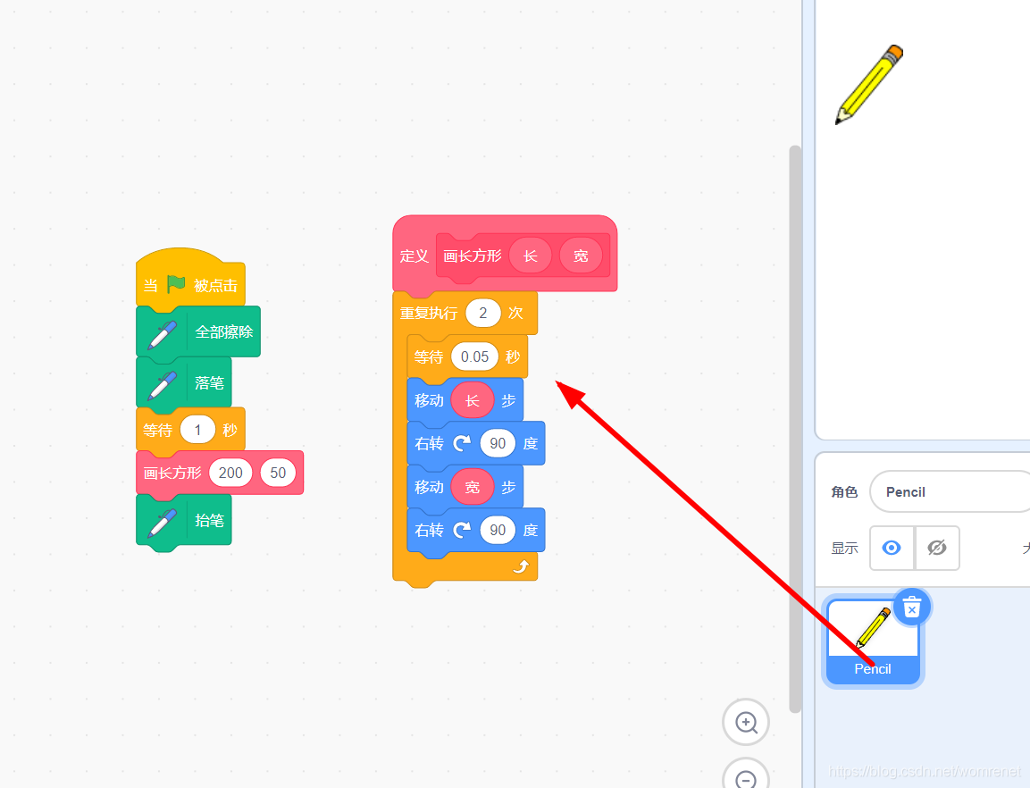 您現在的位置是:首頁 » scratch編程資訊 資訊內容 scratch自制積木教程案例 自制積木 極客小將2022-04-07- 積木:一個程序里面有多個角色需要用到同一腳本,那么將這個腳本定義為一個積木,我們就可以直接用這個積木來代替腳本項目介紹:根據傳遞的參數畫一個長方形。 積木:一個程序里面有多個角色需要用到同一腳本,那么將這個腳本定義為一個積木,我們就可以直接用這個積木來代替腳本項目介紹:根據傳遞的參數畫一個長方形。 ←微信掃描關注公眾號,免費獲取相關素材源碼。 最新版Scratch3.29.1編程軟件 Scratch積木指令學習手冊 Scratch飛機大戰素材.zip Scratch植物大戰僵尸素材.zip Scratch羊了個羊.zip Scratch計算器源碼.zip Scratch五子棋源碼.zip Scratch俄羅斯方塊源碼.zip Scratch打地鼠源碼.zip Scratch大家來找茬源碼.zip Scratch數獨源碼.zip Scratch川劇變臉源碼.zip Scratch電子學會等級考試白皮書 Scratch藍橋杯資料 上百款資料、源碼,關注領取。 本文地址:http://m.91zz.cn/202204072_2675.html 上一篇 Scratch教程-圖章工具 劇本介紹:每年春天我們都需要參加植樹活動,根據鼠標所點的位置進行植樹。代碼截圖: 下一篇 2025學年面向中小學生的全國性競賽活動名單 2025學年面向中小學生的全國性競賽活動名單?序號競賽名稱主辦單位競賽面向學段自然科學素養類1第五屆全國青少年人工智能創新挑戰賽中國少年兒童發展服務中心小學、初中、高中、中專、職高2全國中小學信息技術創新與實踐大賽城鄉統籌發展研究中心、中國人工智能學會 相關資訊 scratch如何使用自制積木 scratch自制積木教程案例 Scratch編程NO40課:自制積木的使用 預約試聽課 已有385人預約都是免費的,你也試試吧...