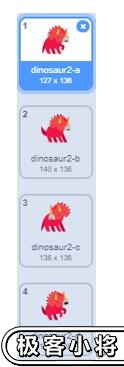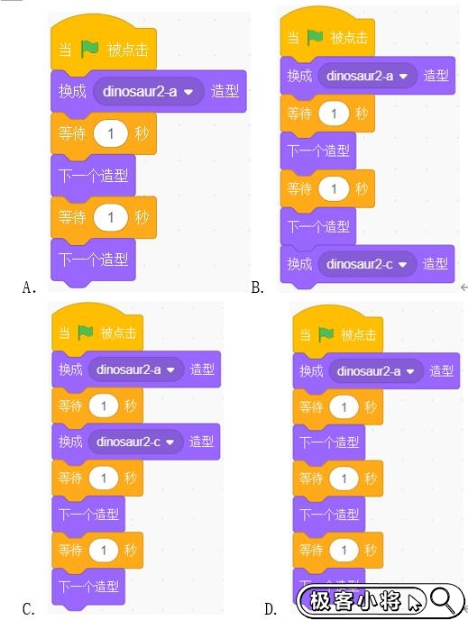 9. Dinosaur2角色的造型如下,下列哪個(gè)選項(xiàng)里的代碼可以實(shí)現(xiàn)造型從第一個(gè)開始,一個(gè)一個(gè)按順序切換到第四個(gè)造型的功能?( )
